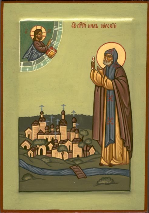 Преподобный Нил Сорский происходил из дворянского рода Майковых, родился в 1433 году. Начало иноческой жизни положил в Кирилло-Белозерской обители, где пользовался советами мудрого и строгого старца Паисия Ярославова, впоследствии игумена Троице-Сергиева монастыря. Спустя несколько времени он вместе с учеником своим и сотрудником монахом Иннокентием отправился в паломничество по святым местам восточным. Несколько лет провел он на Афонской Горе и в монастырях константинопольских, изучая все виды монашеского подвижничества, в особенности – неизвестный ему дотоле вид скитского жития. Главным образом он везде старался вникнуть в смысл и дух так называемого умного иноческого делания, внутреннего самоиспытания, все применяя к себе, к собственной духовной жизни. Внимательно св. Нил изучал и опытом проходил наставления богомудрых древних отцов Антония Великого, Ефрема Сирина, Исаака Сирина, Варсонофия, Иоанна Лествичника, аввы Дорофея, Максима Исповедника, Исихия, Симеона Нового Богослова, Петра Дамаскина, Григория, Нила и Филофея Синайских. И, возлюбив скитский образ жизни, пребывая еще на Афоне, у него явилась мысль и по возвращении на родину начать этот новый, по образу восточных подвижников, вид жизни для иноков. До него на Руси было два вида иночества: общежительный и отшельнический. Нил положил начало третьему – среднему пути подвижничества: иноки селились один от другого на таком расстоянии, чтобы можно было только слышать голос друг друга, а подвизались каждый особо. Возвратясь на Русь в Белозерский монастырь, преподобный Нил уже не остался жить в нем, ибо слишком глубоко запала в душу его любовь к уединению. Сначала срубил себе келлию невдалеке от монастыря; потом отошел за 15 верст, где обрел свою Палестину в дикой глуши Вологодской земли на берегу безвестной реки Сорки. Там водрузив крест, поставил сперва часовню и уединенную келлию, и при ней ископал кладезь, а когда собралось к нему для сожития несколько братии, то построил деревянную церковь Сретения Господня. Таким образом составился первый русский скит с новым в то время уставом, заимствованным Нилом на Афоне.
